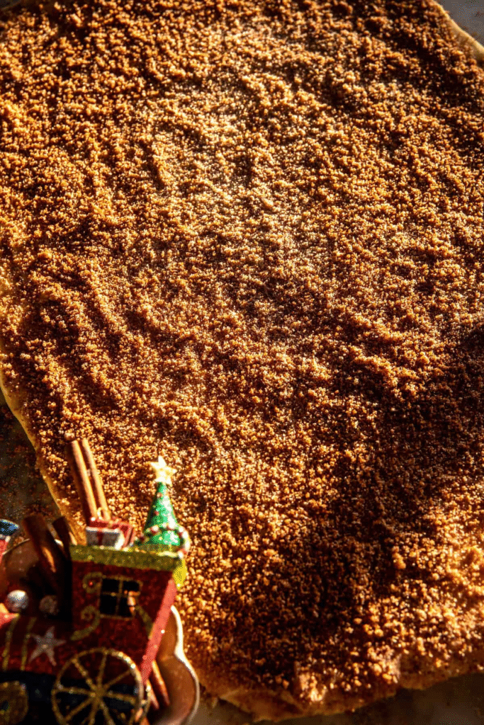 Slather the whole surface with softened butter (I use salted). Then, sprinkle the cinnamon sugar mix all over.