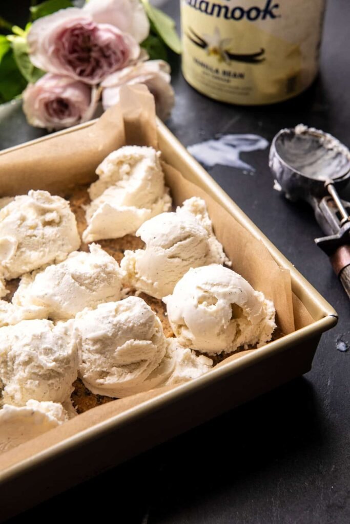 Pop it in the freezer for about 15 minutes—just long enough to firm up. Then, spread a thick layer of vanilla ice cream over the top. (I’m partial to Tillamook—it’s extra creamy—but use your favorite brand.)