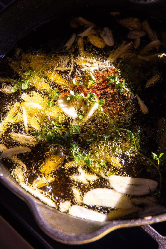 Simmer extra virgin olive oil with thinly sliced garlic, fresh thyme, and chili flakes until the garlic turns golden and crispy. Right before taking it off the heat, stir in chopped pistachios and a pinch of salt.