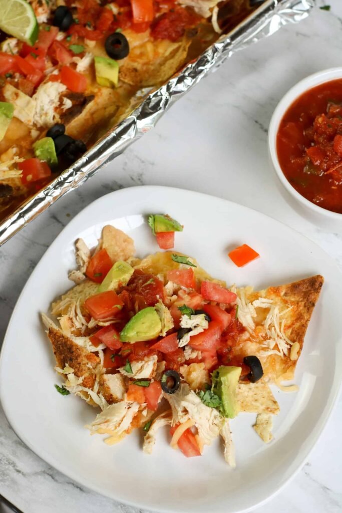 Once out of the oven, serve the nachos immediately. Add your favorite toppings like guacamole, sour cream, and fresh cilantro for a burst of flavor. You can also squeeze a little lime juice over them if you like some extra zest.