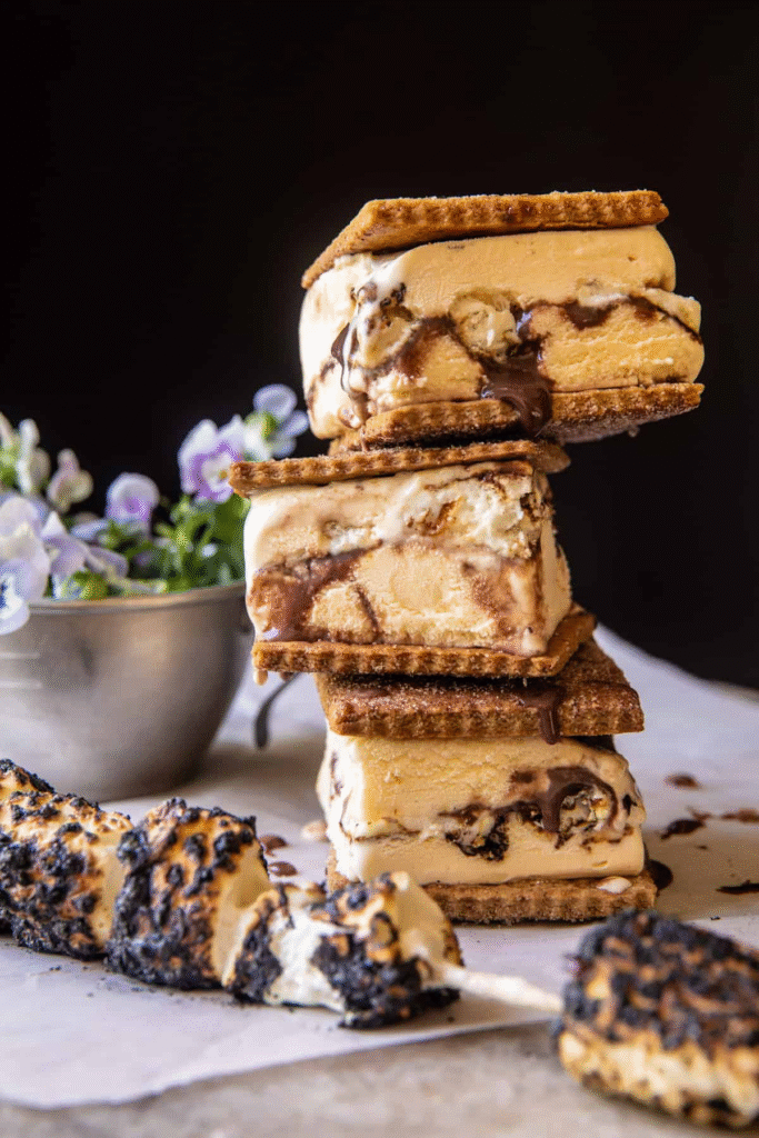 Toasted S’mores Ice Cream Sandwiches Close your eyes for a moment and imagine you’re about to take a bite into something cold, sweet, and all-around delicious, these are exactly that! You can picture crispy, cinnamon packed graham crackers, with layers of vanilla ice cream mixed with a rich chocolaty fudge sauce and chewy toasted marshmallows! Each layer is like a mini campfire dessert, warm, melty, and full of flavor. The vanilla ice cream is chilled, the fudge is decadent, and the toasted marshmallows are just sweet enough to still taste like a s’more. Honestly, this is the ultimate summer treat, frozen, chocolaty, and just sweet enough to put a smile on your face Let me be real with you, they are super fun to make, and even more fun to eat. They are sweet, a little fancy-feeling, but still fully not hard to make, at all. Most important? They are sooooo summer. Seriously, what’s better than dessert that tastes like bonfire night but is cold and creamy instead? Now I want to confess something to you, I’m not typically a marshmallow person.